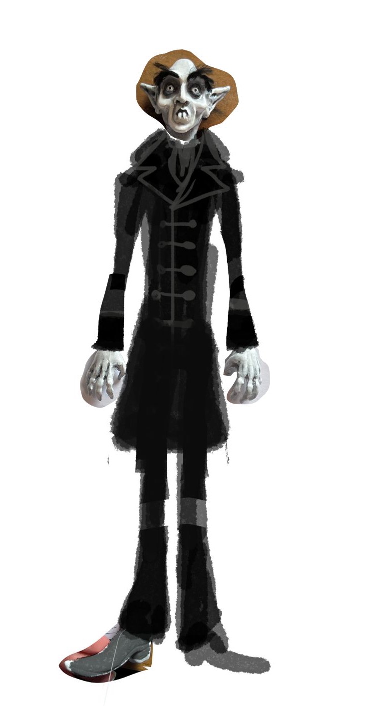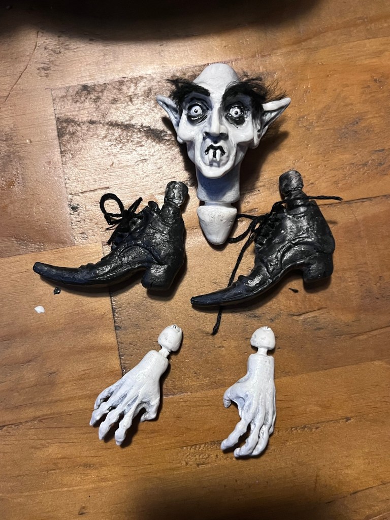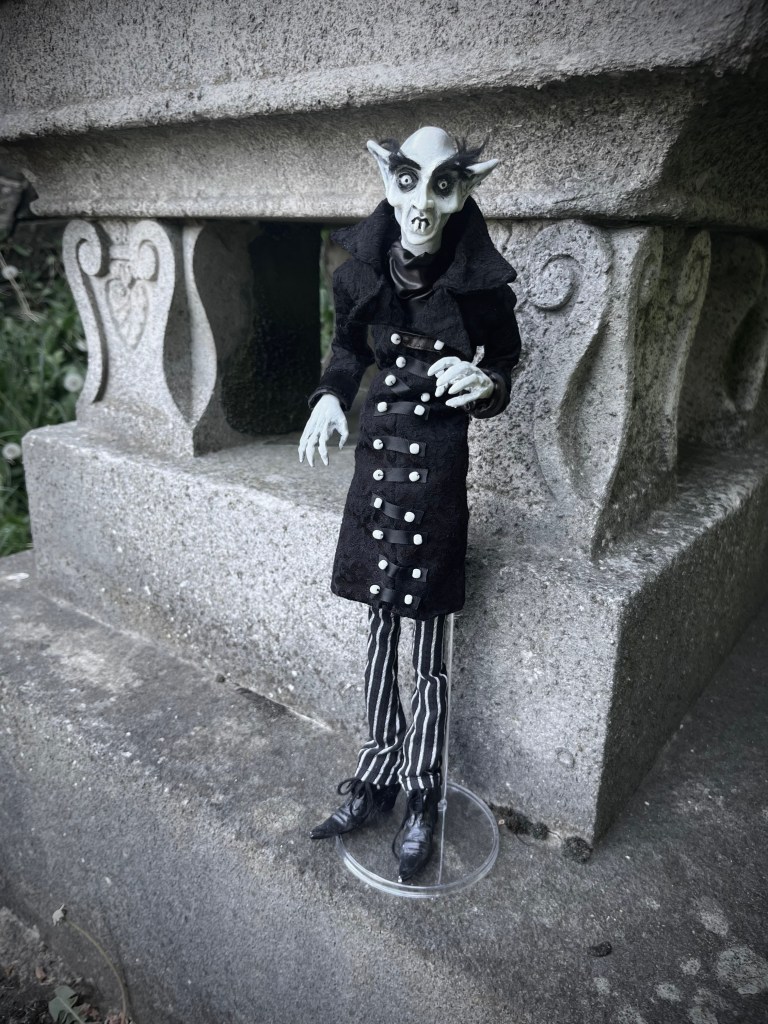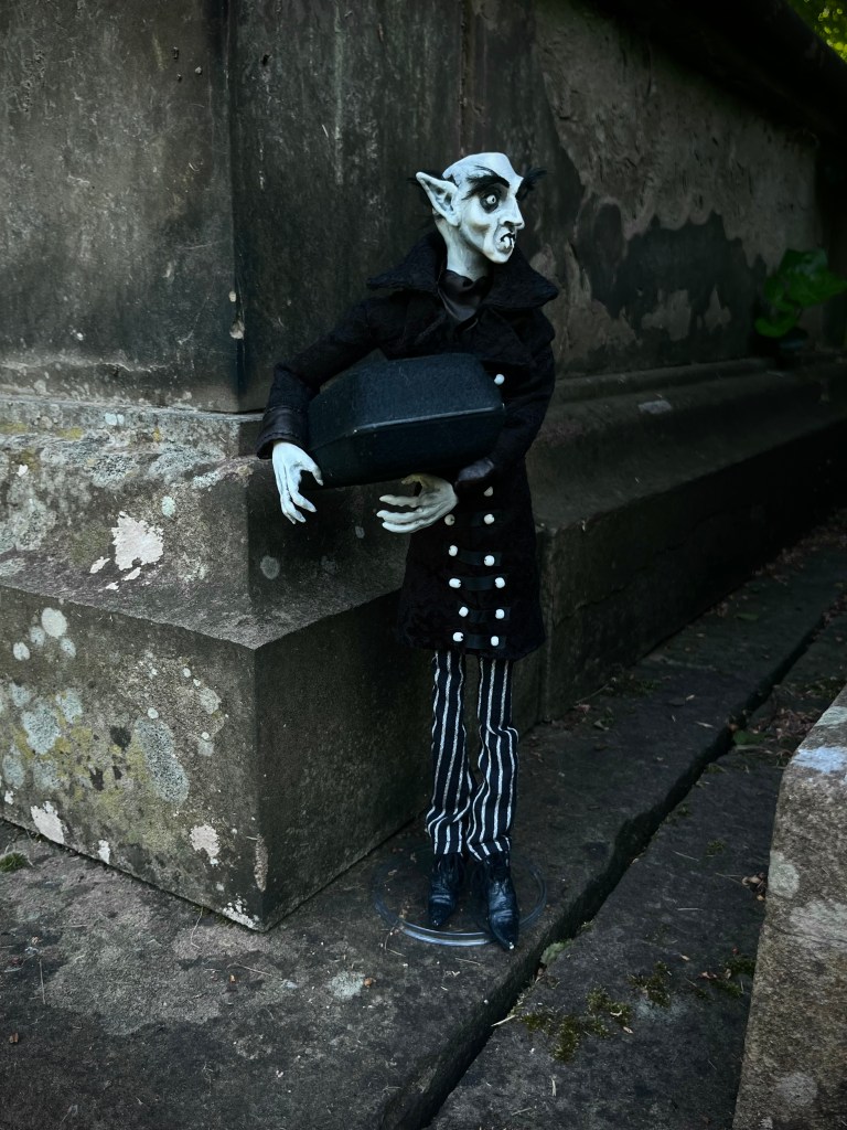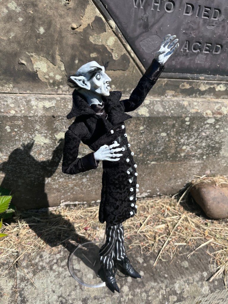 My interpretation of Count Orlok from Nosferatu as an art doll/puppet. He stands around 25cm tall with polymer clay head, hands and shoes mounted on a wire armature to allow full posing. Each aspect of the doll was hand sculpted and painted, or patterned and sewn by me.